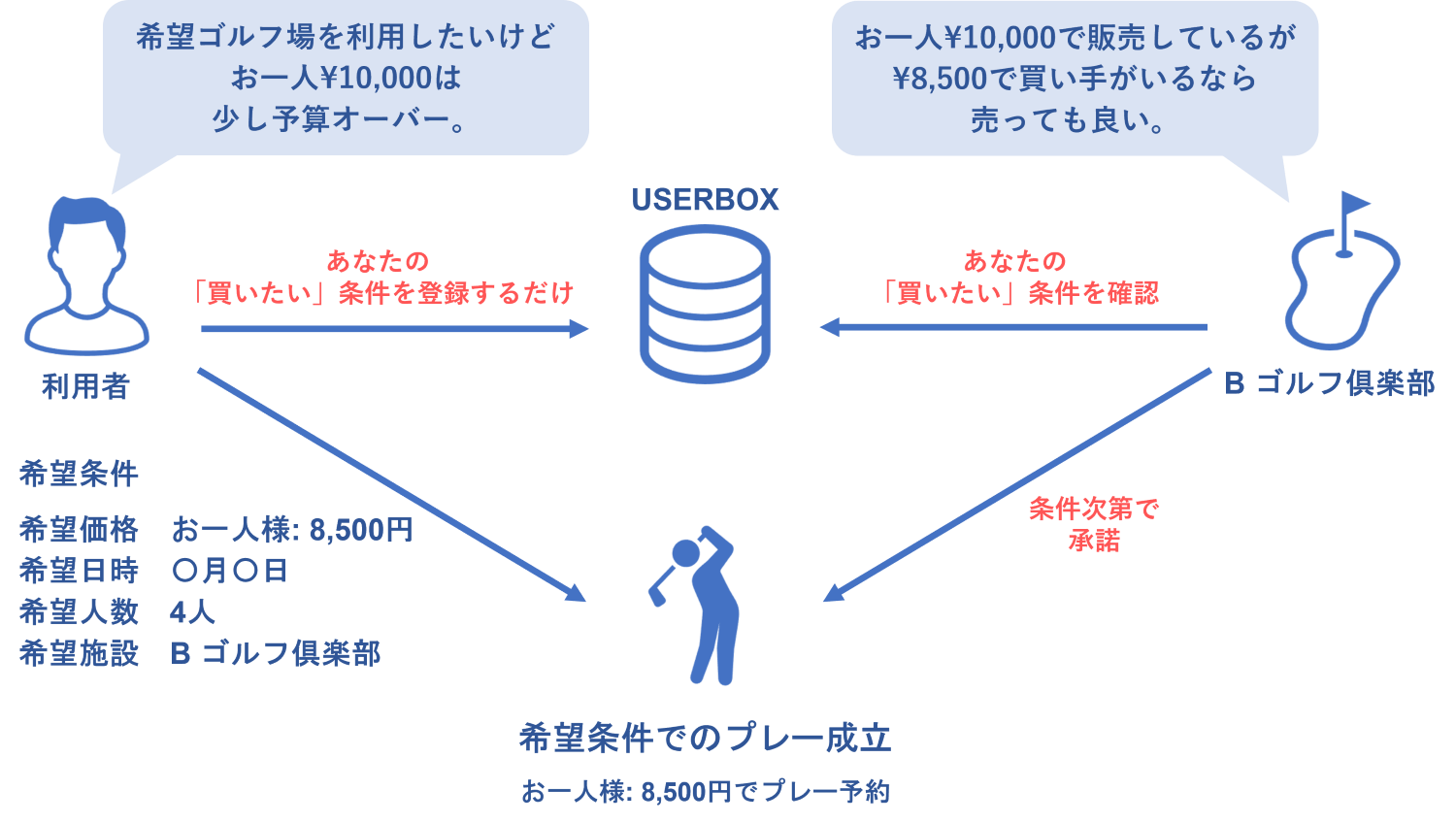 『USERBOX』とは、購入を希望するサービスや商品の希望購入価格、その他の希望条件をデータベースに登録することで買う側の購買意思を見える化し、それらを売る側に提示することにより、売る側の「売りたい」と買う側の「買いたい」をダイレクトに、効率的にマッチングさせ、買い手と売り手、双方の希望を実現させていくサービスです。